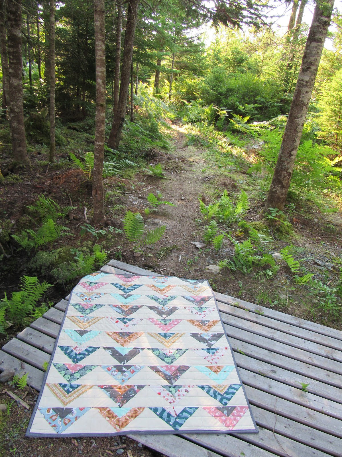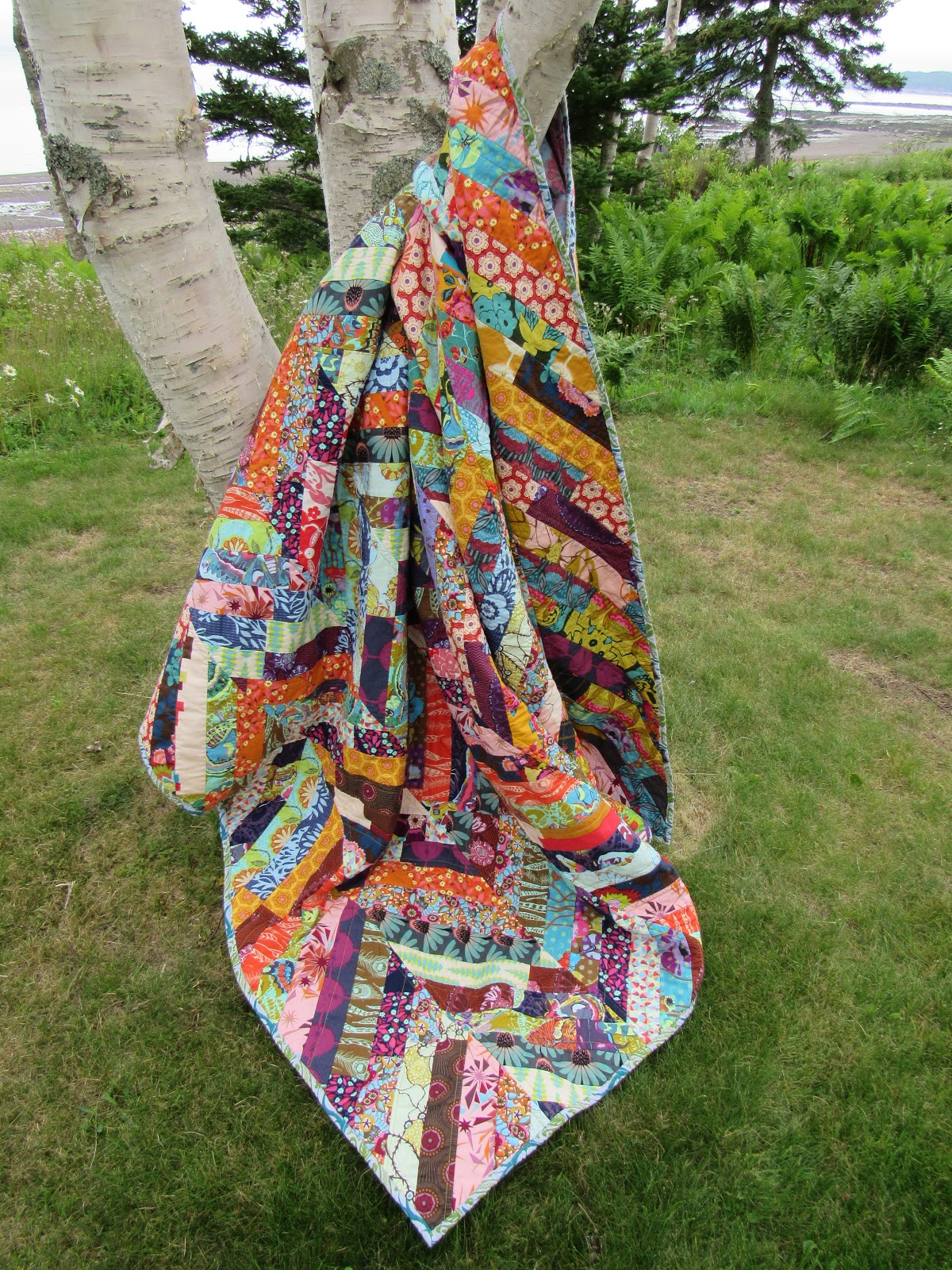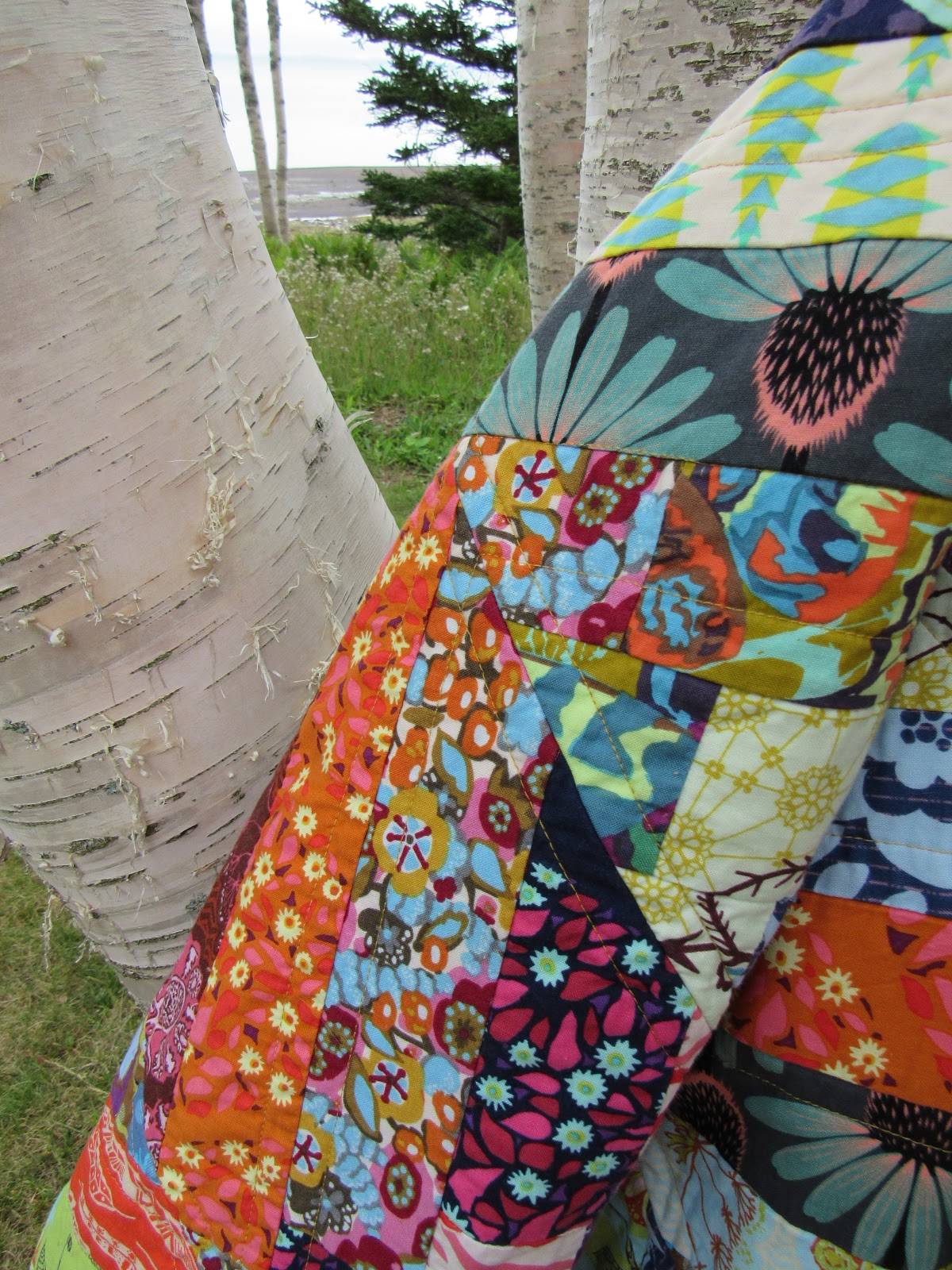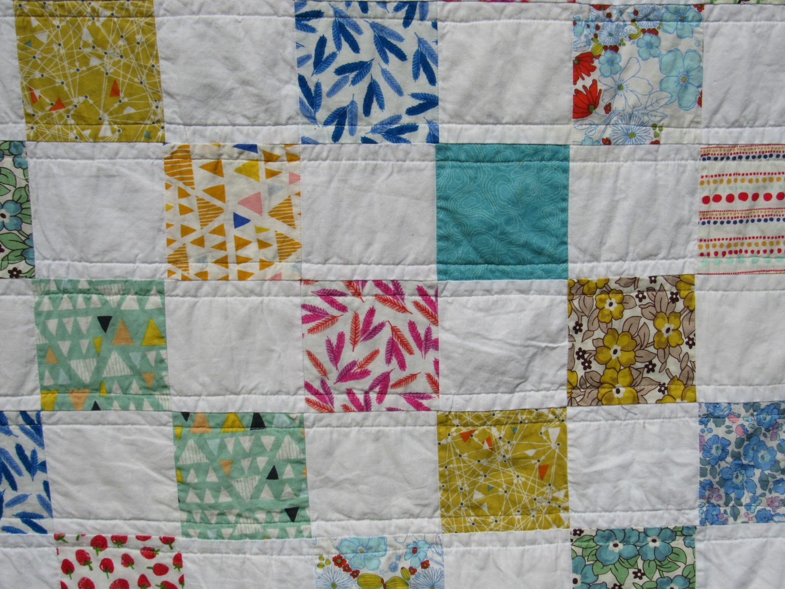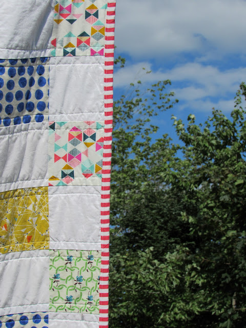 I really loved working on this quilt through the winter. On some of the coldest days we had I would pull out the white and brightly colored squares and work away, dreaming of summer days...