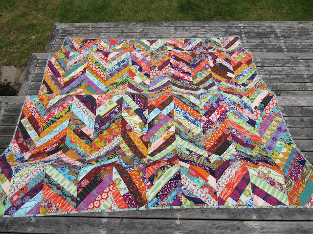 The other thing that deterred my from going any bigger was the wonkiness I ran into while making the quilt. I think part of the issue was I was trying to go too big at once. Those LONG columns of batting my not have been the straightest and the angles of my herring bones may have gotten a tad off track as I moved down the columns. So if you examine it too close it is a bit of a hot mess, but it's MY hot mess :)