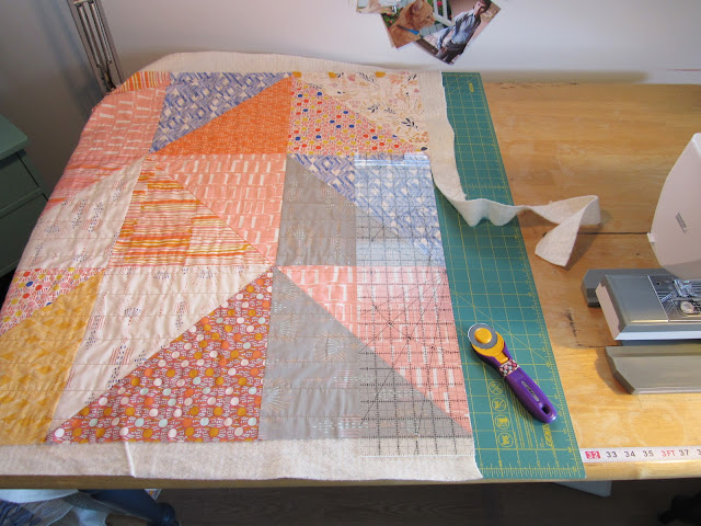 I didn't have enough Leah Duncan for binding but this Heather Bailey True Colors number was perfect. You now have a giant quilt and your back and shoulders are hopefully saved a little!